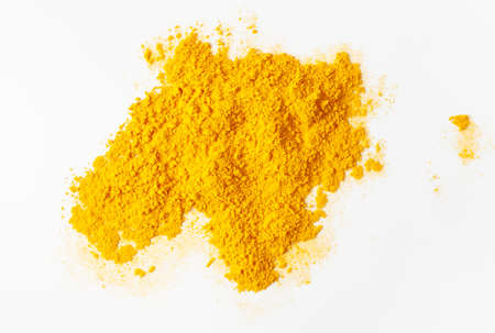 A vibrant yellow pile of turmeric powder on a white background, showcasing its rich color and granular texture, ideal for culinary and medicinal uses.