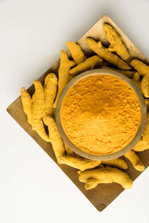 Bright yellow aromatic spice turmeric for health and beauty. Turmeric on a white background for health and beauty Copy space text.