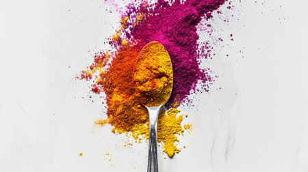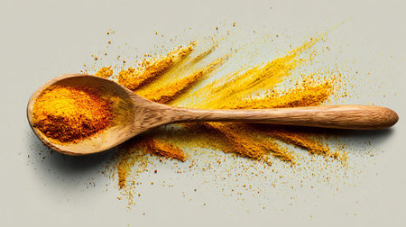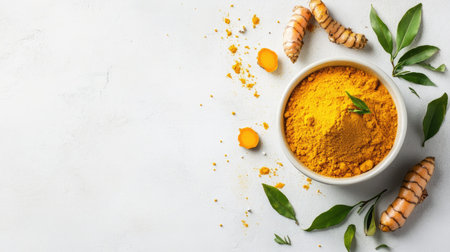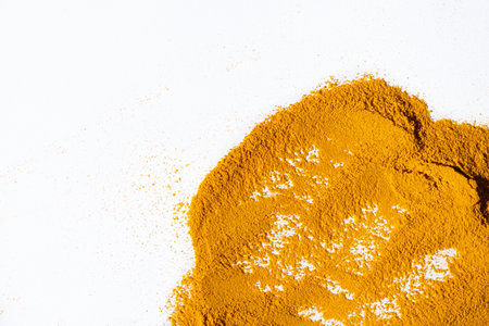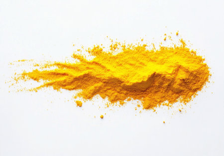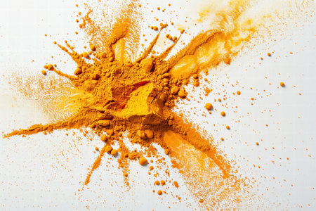 Vibrant turmeric powder scattered on white surface, vibrant culinary ingredient concept