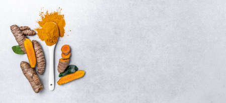 turmeric powder in spoon with turmeric root. curcuma or curcumin on concrete background. Spice, natural coloring, alternative medicine. Long banner format. top view.