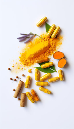 Natural Healing Herbal Medicine Turmeric, Nutritional Turmeric, Pills, in the photo from a top angle Generate AI