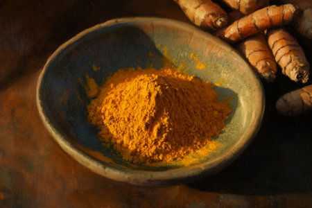 urmeric powder in a rustic setting, a golden spice with various health benefits