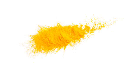 Dry turmeric powder isolated on white background.Close-up of powder orange color turmeric.top view and copy space