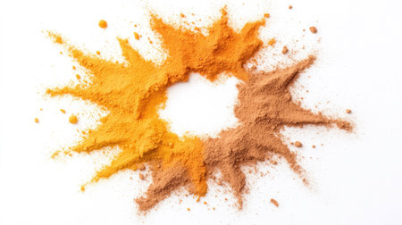 Colorful explosion of turmeric and cinnamon powder creating a vibrant splash, ideal for healthy eating concepts with a focus on spices