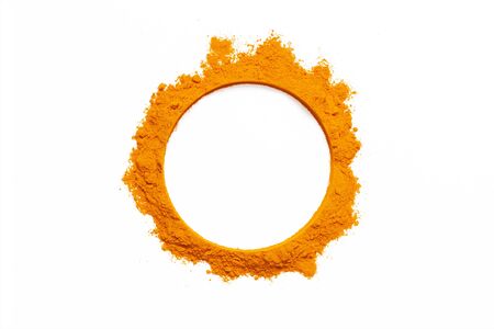 Circle Frame of turmeric powder on white background, healthy promo poster, copy space for text