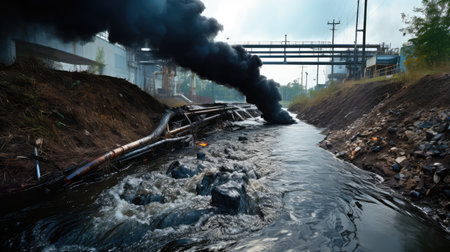 Dirty wastewater pouring from an industrial pipe into a river, representing pollution and environmental harm, with a focus on the murky water