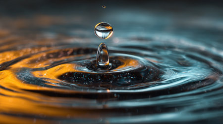 A captivating close-up of a water drop creating ripples. Reflecting nature's tranquil beauty. Ideal for themes of purity, freshness, and serenity.
