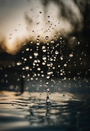 Close-up of raindrops creating ripples as they fall into water, with a bokeh effect. Ideal for nature and tranquility themes.