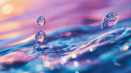 Water droplets on a reflective surface with pastel background, macro photography concept