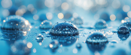 Liquid Art, Macro Photography Water Droplets Frozen in Motion on a Vibrant Blue Surface
