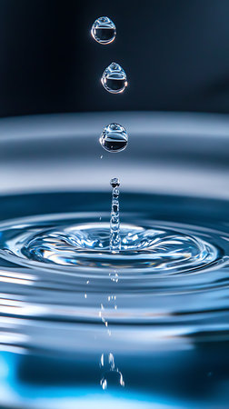 Water droplets impacting surface creating ripples in fluid environment
