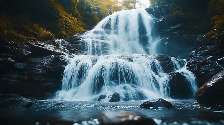 Majestic waterfall cascading over rocky cliffs surrounded by lush green forest and bright natural light illuminating the flowing water in a serene outdoor setting.