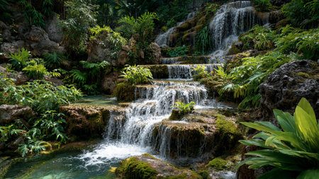A stunning waterfall flows down rocky cliffs into a serene blue pool, embraced by vibrant green foliage. The scene captures the essence of nature such untouched beauty and tranquility.