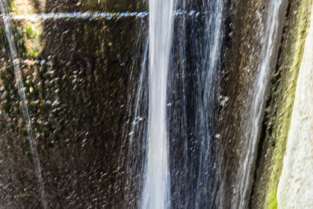 The texture of the falling water of a small waterfall from a hill close-up on a sunny day. Background, texture