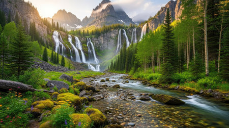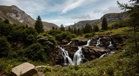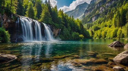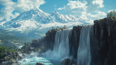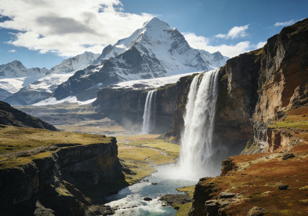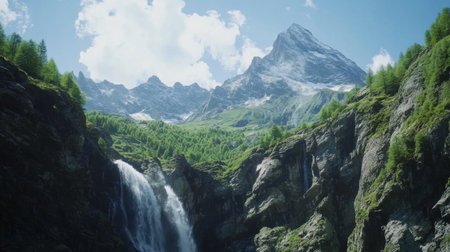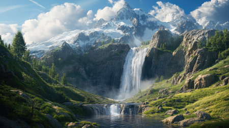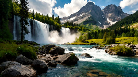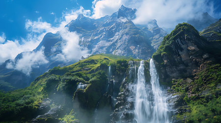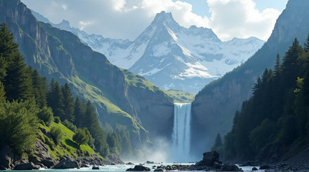 Majestic mountain waterfall cascading through lush green valley landscape scenery and snow capped peaks