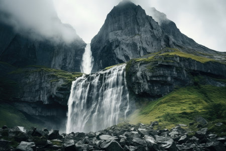 the photo showcases a mesmerizing waterfall in a dark and foreboding landscape. with its photorealistic artistry and birds-eye-view perspective, this 32k uhd image captures the beauty and intricacy of the norwegian nature. the composition exudes a sense of mystery and awe, immersing viewers in the photorealistic detail of the cascading waterfalls. ai generated