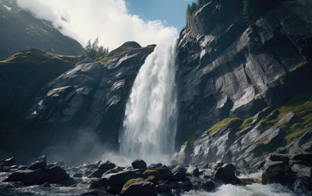 the essentialness of a astonishing waterfall since it bounced down cruel cliffs, making a dim appear. Creative resource, AI Generated