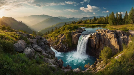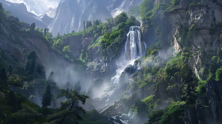 A breathtaking waterfall tumbles dramatically from towering cliffs, creating a misty spray that dances in the sunlight. Lush greenery frames this natural wonder, inviting tranquility.