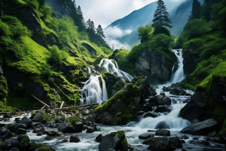 the essentialness of a dazzling waterfall since it bounced down callous cliffs, making a dim appear. Creative resource, AI Generated