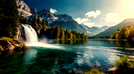 Autumn alpine lake with waterfall and pine trees. Beautiful nature landscape