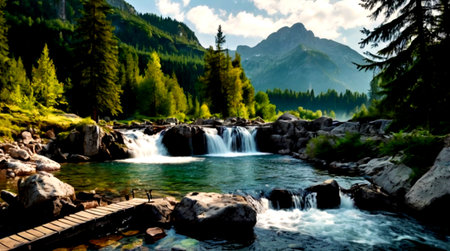 Flowing water cascades down majestic mountain range generated by artificial intelligence