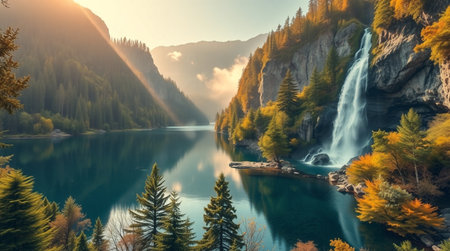 Autumn landscape with mountain lake and waterfall. 3d rendering.