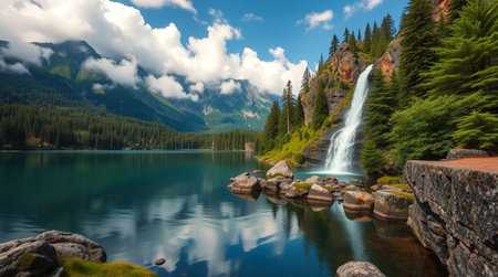Beautiful view of alpine lake with waterfall in the foreground.