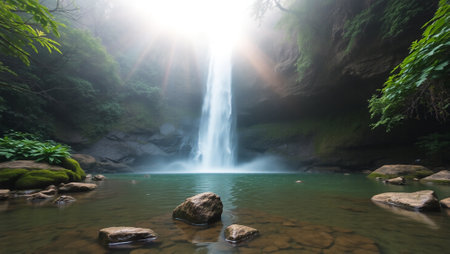 Majestic Waterfall in Lush Green Forest with Sun Flare and Mist