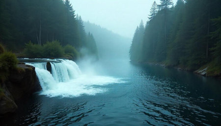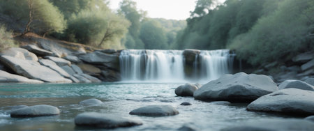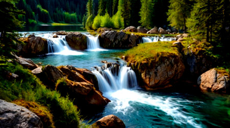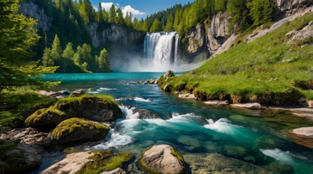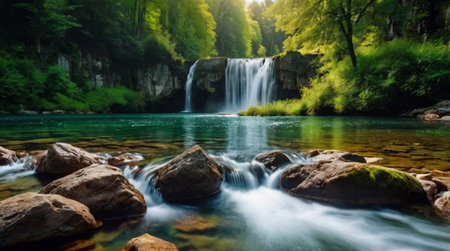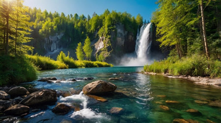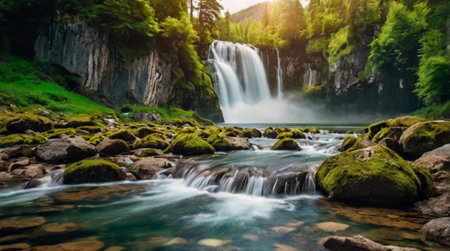 Serene waterfall in a mystical forest. Peaceful nature scene.
