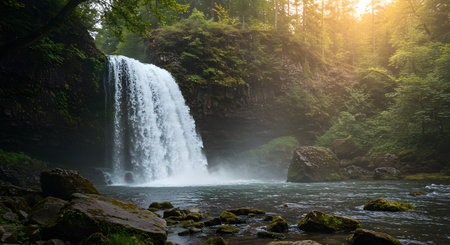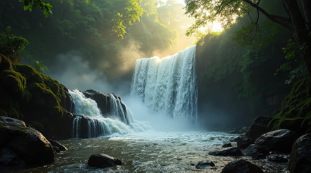 Majestic waterfall cascades through lush forest canopy as golden sunbeams pierce the mist. The powerful flow creates a serene, misty atmosphere. Perfect for themes of nature's beauty, wilderness, tranquility