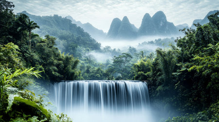 Misty waterfall flows through lush green forest. Serene and magical scene.