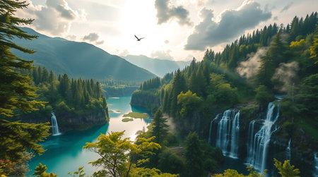 AI-generated Majestic cascading waterfalls plunge into a turquoise alpine lake surrounded by steep, pine-covered cliffs and mountains, dramatically illuminated by sun rays breaking through the mist in remote wilderness.