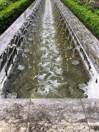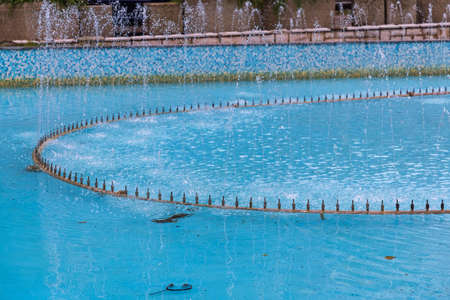 Fountain in city. Water jets in area. flow of water. Details of square.