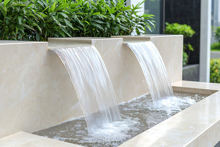 This image showcases a modern water feature with elegant streams flowing gently over marble, enhancing the tranquil atmosphere of a well-designed garden space.