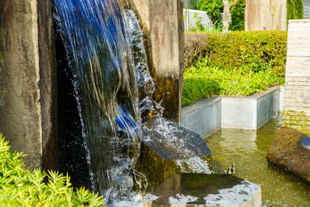 Unusual modern fountain design. Water flows cascade down the blue ceramic ladder steps in fountain in city park. Outdoor free entertainment for people.