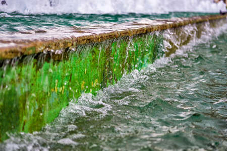 Water splashes from fountain on vivid green background. Natural texture of only water of fountain against greenery. High waves effect in hot summer with copy space. Water sprays in sunny day close-up.