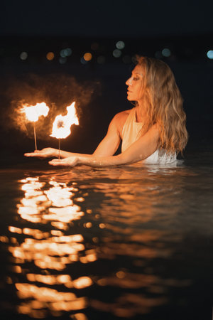 Caucasian woman dancing with fire in the water. Fire show at sea. Acrobatics on the beach. Yoga and relaxation at sunset. Spectacular circus performance. model body. High quality FullHD footage.