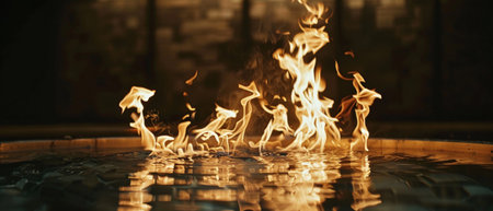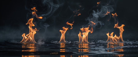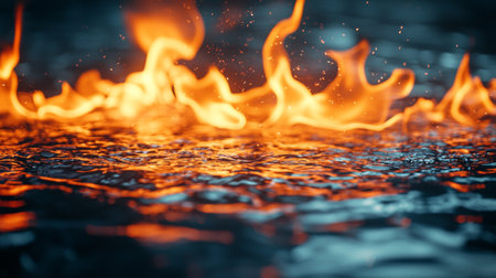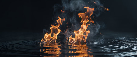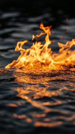Fire on water surface, dramatic contrast. Elemental nature and danger concept