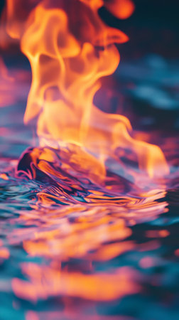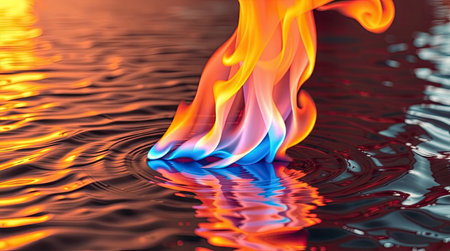An artistic image presents a vibrant flame emerging from a rippling water surface. The composition showcases a spectrum of colors including orange, yellow, and blue. The visual style is abstract, employing soft lighting and a reflective effect. This scene could be suitable for various creative projects and editorial content.