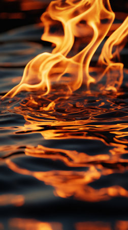 Flames reflecting on rippling water surface, abstract art. Fire and water concept