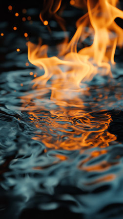 Dynamic image captures colorful flames burning atop a rippled water surface. The composition showcases vivid hues of orange, yellow, and blue contrasted against the dark backdrop. The overall aesthetic suggests a tranquil yet powerful scene. Suitable for illustrating concepts related to energy, nature, or visual art.