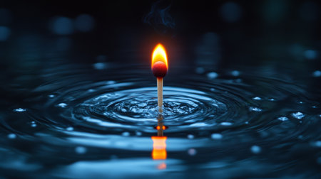 Lit matchstick creating ripples in water, abstract visual. Harmony and contrast concept