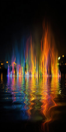 Vibrant abstract light patterns in a spectrum of colors creating a mesmerizing fantasy reflection on calm water at night, symbolizing energy and motion
