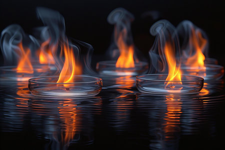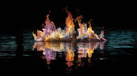 An artistic illustration features vibrant flames in shades of orange, yellow, and purple reflected on a water surface. The composition is set against a dark background, highlighting the colorful display. Suitable for various creative projects, this image may be used for editorial content or commercial design.