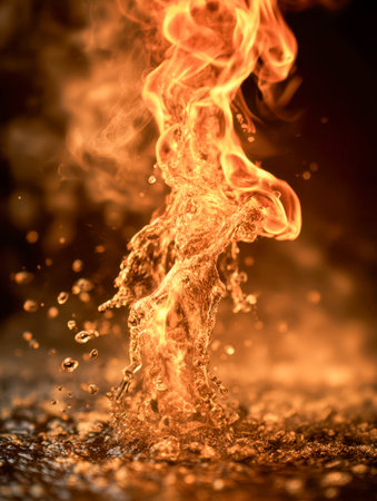 A captivating scene where blazing fire intertwines with glowing molten water, illustrating the raw energy and mesmerizing contrast of destructive warmth and fluid grace.