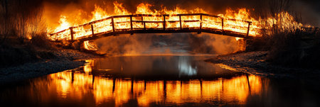 Huge flames engulfing a wooden bridge over a river at night, creating a dramatic reflection in the water, symbolizing destruction, danger, and emergency situations