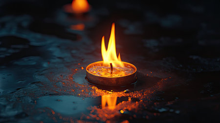 A serene candle glowing gently on a water surface, surrounded by small raindrops, creates a calming and peaceful ambiance perfect for relaxation.