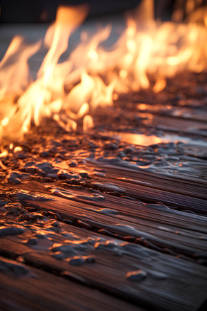 Flames of a fire in a restaurant on a wooden floor.