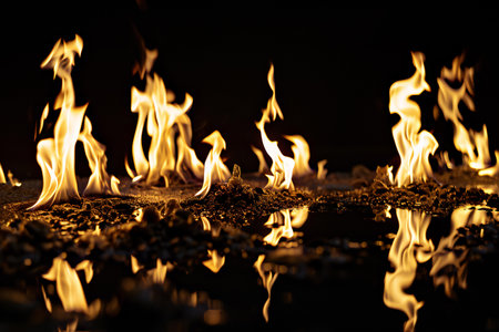 Fire flames at night with reflection on water surface. Fire flames background