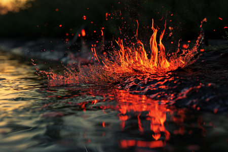 Contrasting elements of fire and water intertwine beautifully against a dark backdrop